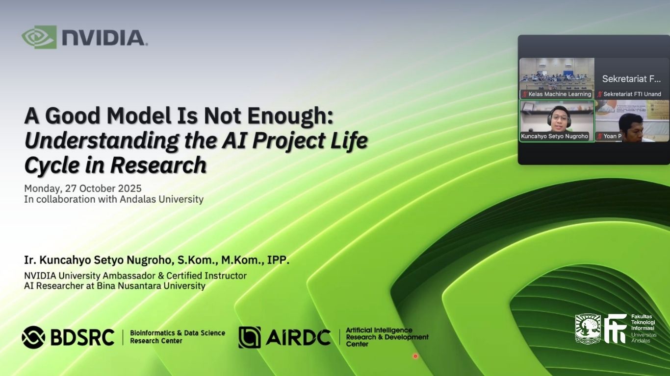 Kegiatan ini menghadirkan Ir. Kuncahyo Setyo Nugroho, S.Kom., M.Kom., IPP., seorang NVIDIA University Ambassador & Certified Instructor, sekaligus AI Researcher di Bina Nusantara University.