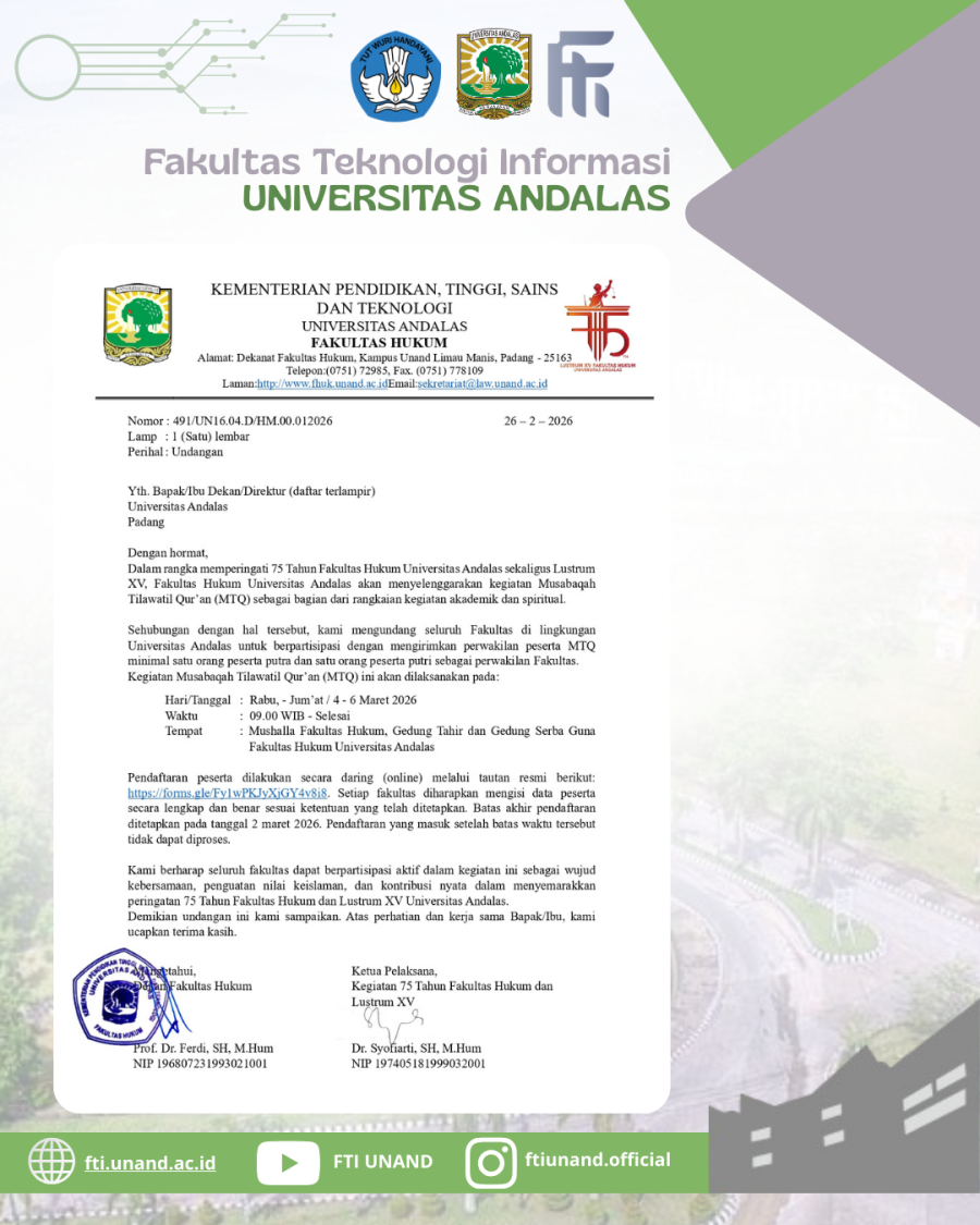Dalam rangka memperingati 75 Tahun Fakultas Hukum sekaligus Lustrum XV, Fakultas Hukum Universitas Andalas akan menyelenggarakan kegiatan Musabaqah Tilawatil Qur’an (MTQ) sebagai bagian dari rangkaian kegiatan akademik dan spiritual.