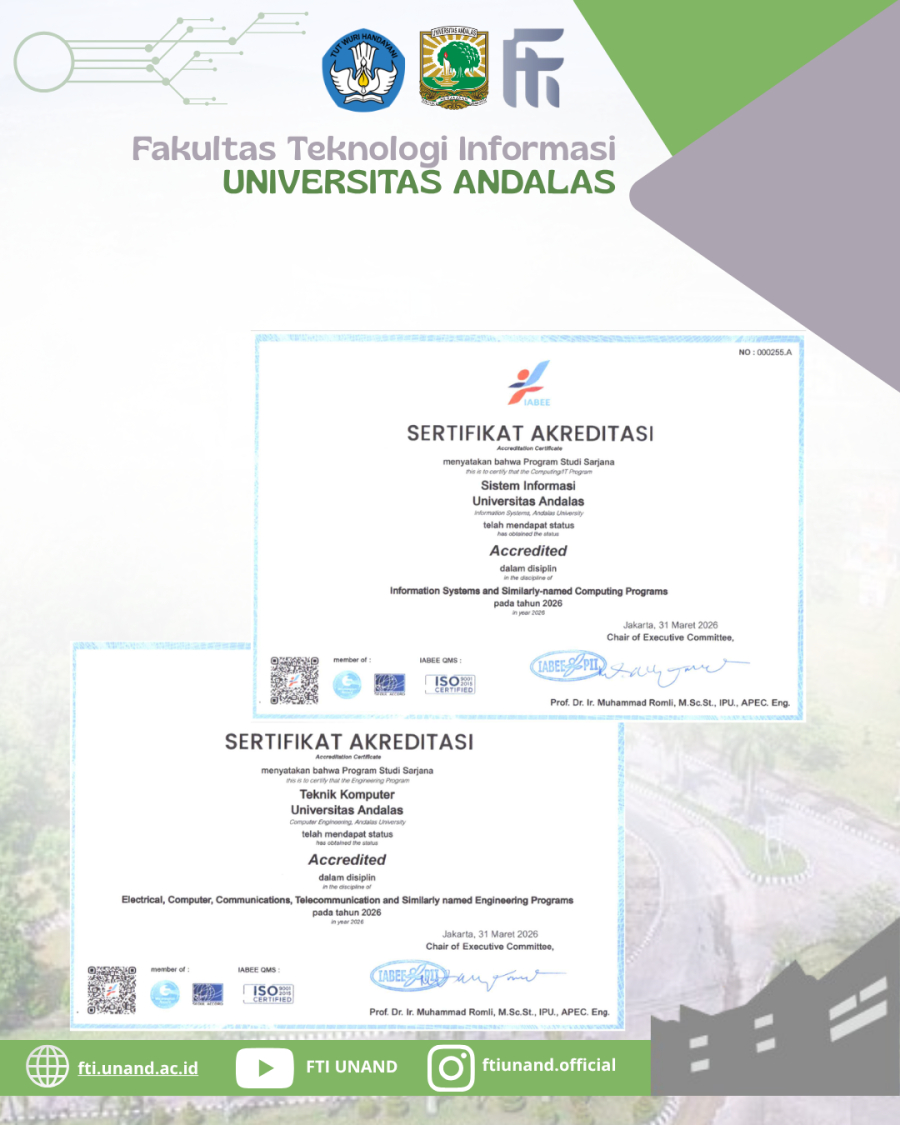 Fakultas Teknologi Informasi dengan bangga mengumumkan bahwa dua departemen di lingkungan FTI telah berhasil meraih akreditasi internasional dari IABEE (Indonesian Accreditation Board for Engineering Education).
