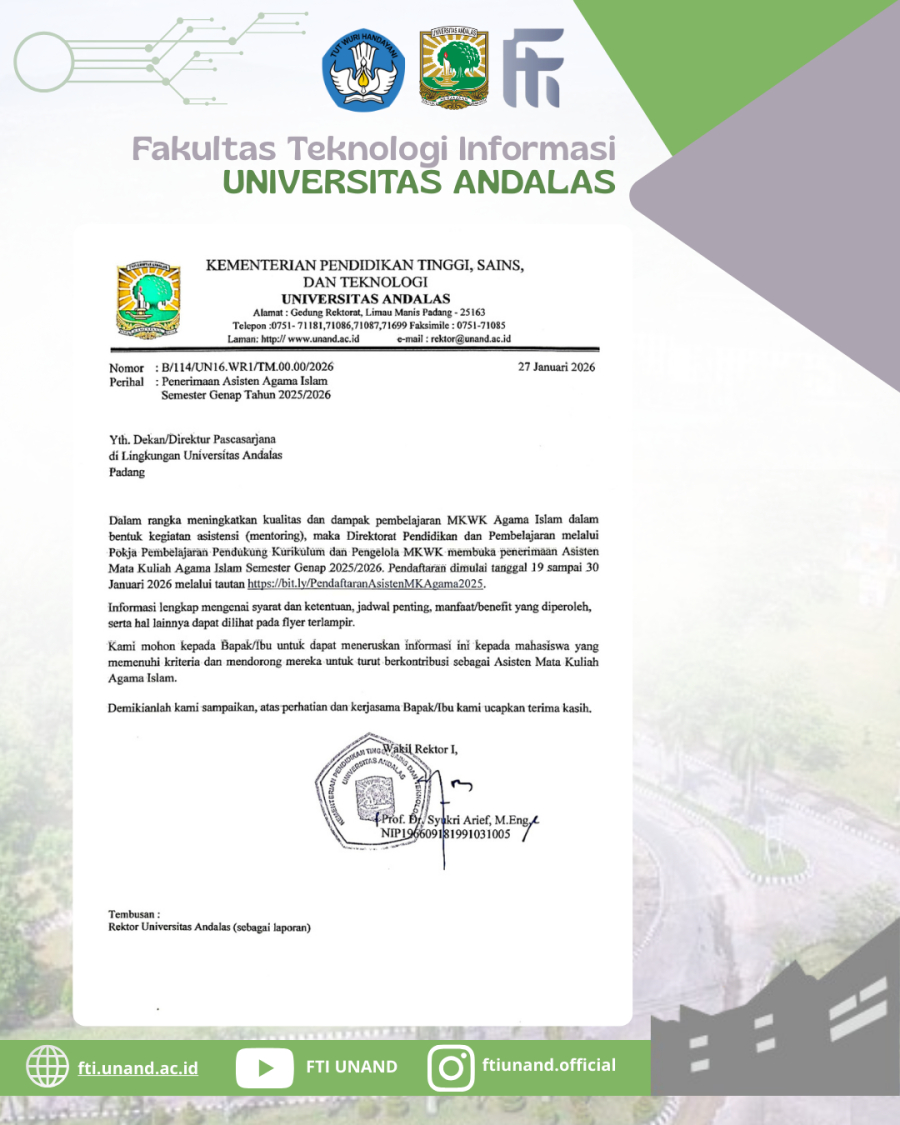 Dalam rangka meningkatkan kualitas dan dampak pembelajaran Mata Kuliah Wajib Kurikulum (MKWK) Agama Islam melalui kegiatan asistensi (mentoring), Direktorat Pendidikan dan Pembelajaran Universitas Andalas melalui Pokja Pembelajaran Pendukung Kurikulum dan Pengelola MKWK membuka Penerimaan Asisten Mata Kuliah Agama Islam Semester Genap Tahun Akademik 2025/2026.