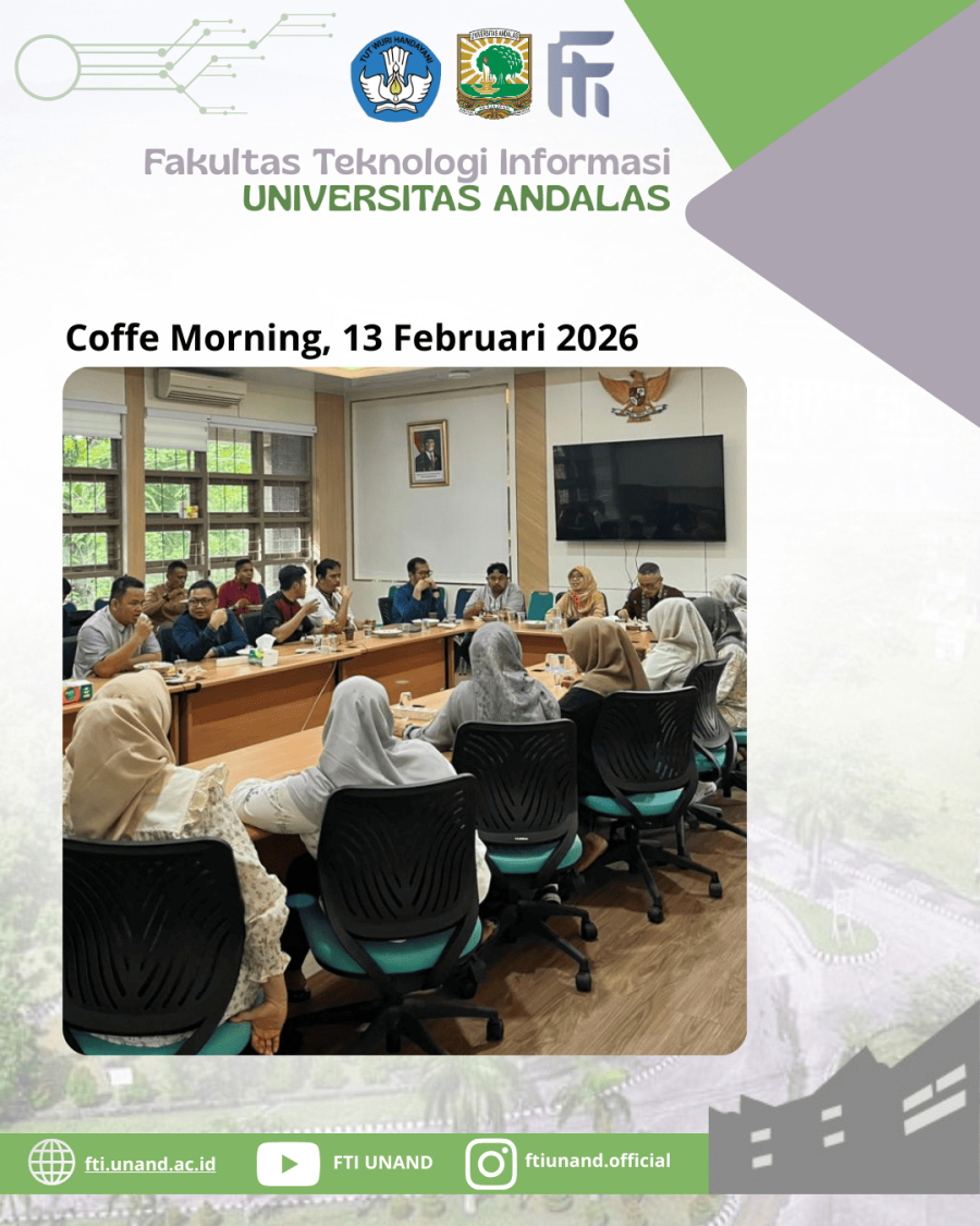 Pada tanggal 13 Februari 2026, Fakultas Teknologi Informasi Universitas Andalas mengadakan Coffee Morning Civitas Academica FTI Unand yang diadakan di Ruang Rapat FTI. Coffe morning ini dihadiri oleh pimpinan, dosen serta tenaga kependidikan dari Fakultas Teknologi Informasi. Acara ini diakhiri dengan makan bersama dan sekaligus menyambut bulan suci Ramadhan dari Civitas Academica FTI Unand. Dengan adanya acara seperti ini diharapkan akan terjadi kekompakan dan peningkatan kinerja dari Civitas Academica FTI Unand.